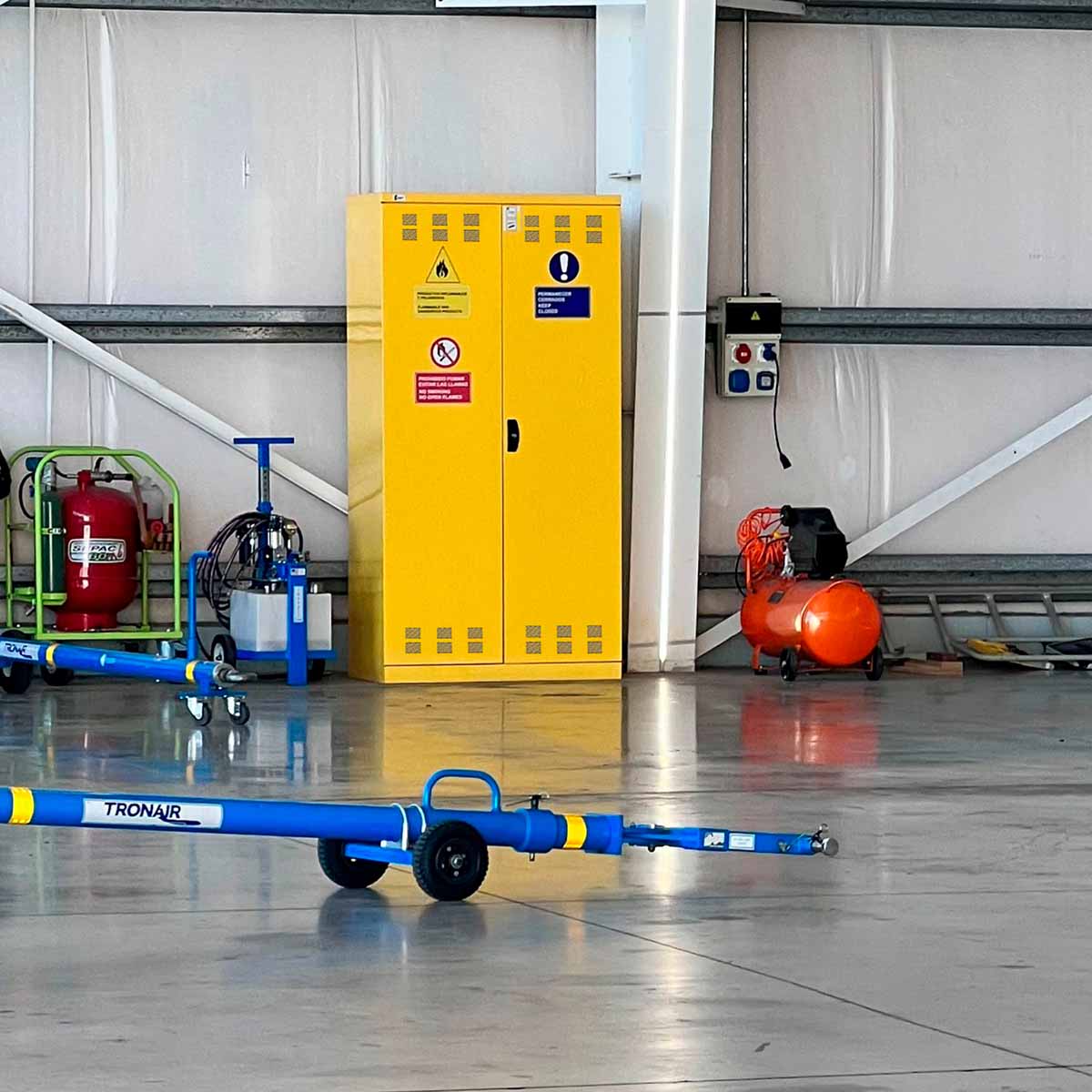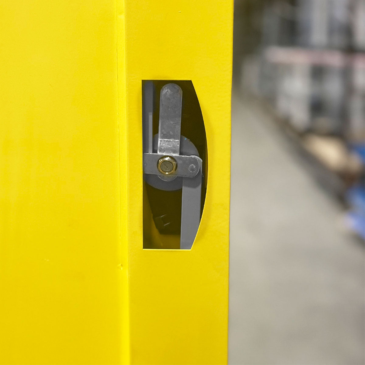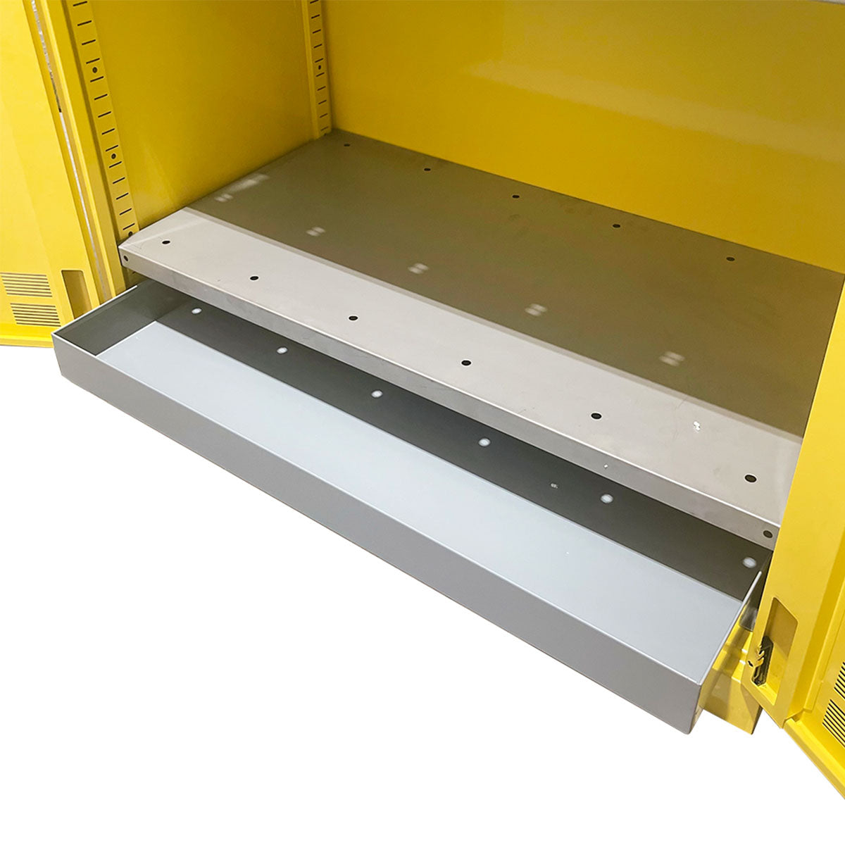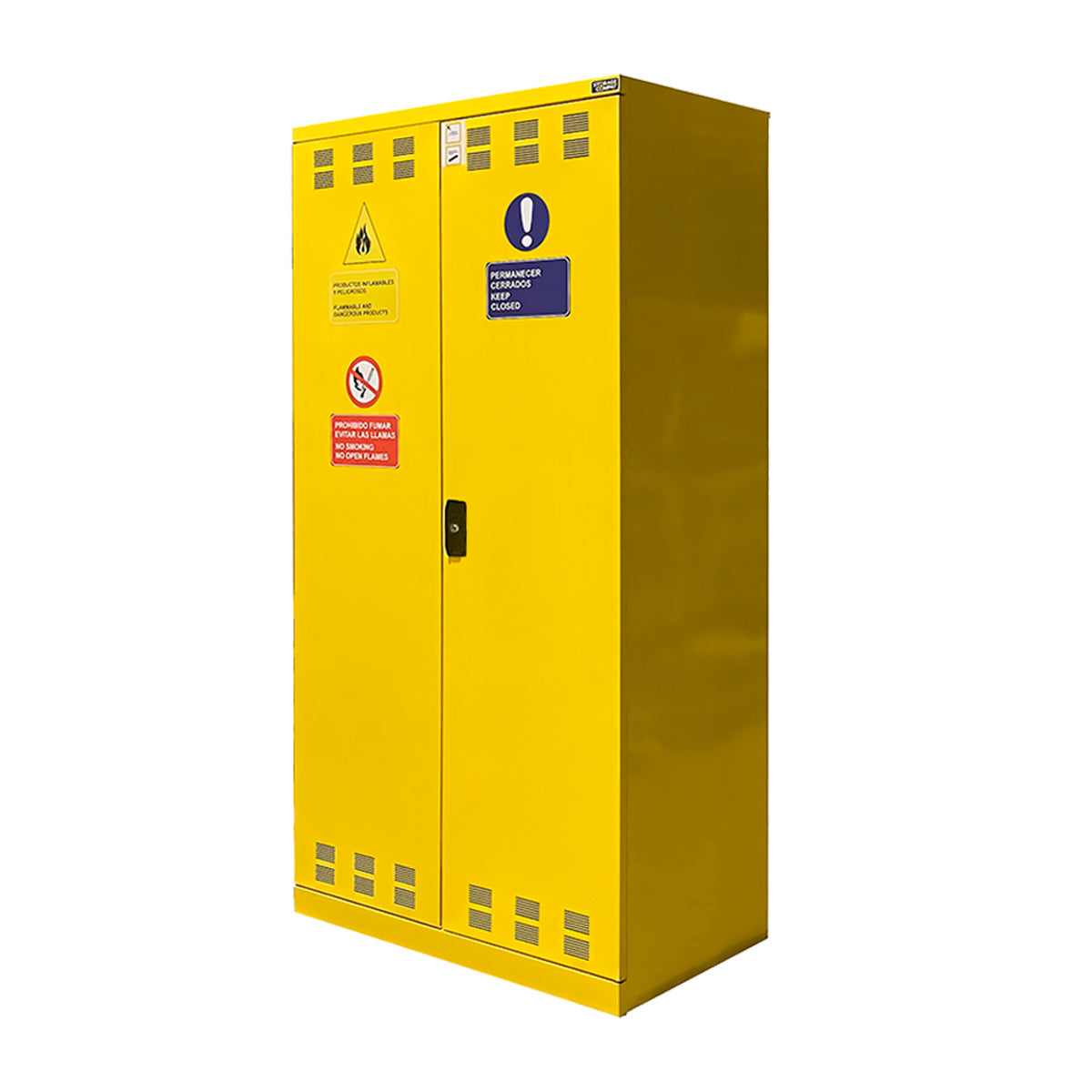 Armario de Seguridad metálico para líquidos peligrosos, como pinturas y solventes, con puertas y accesorios, construido con chapa de acero 7/10mm, con todos los bordes expuestos doblados.