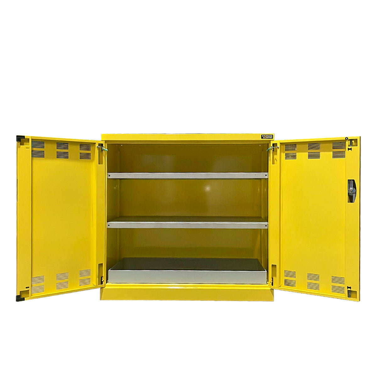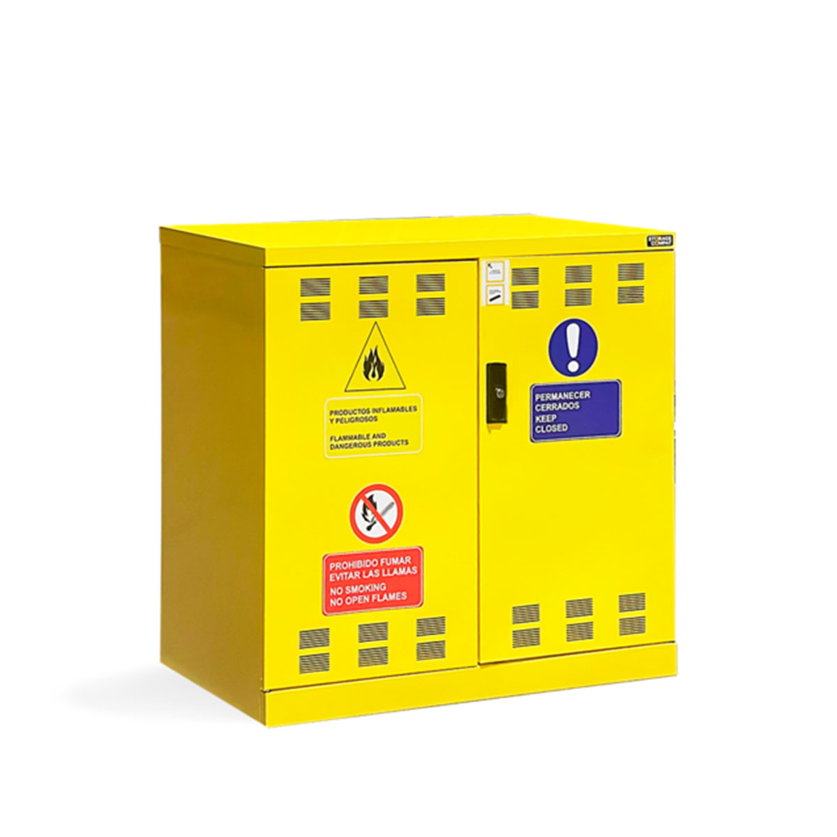 Armario de Seguridad metálico para líquidos peligrosos, como pinturas y solventes, con puertas y accesorios, construido con chapa de acero 7/10mm, con todos los bordes expuestos doblados.