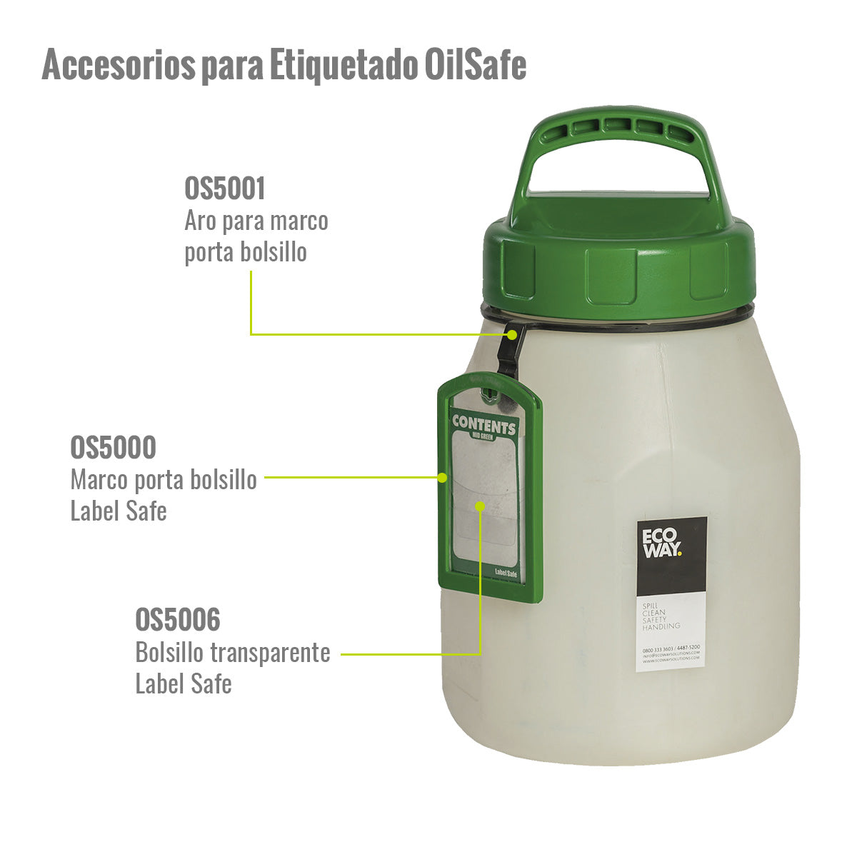 Diseñado específicamente para bidones de transferencia OIL SAFE, el Aro OilSafe provee una manera segura de sujetar el sistema Marco/Bolsillo a los mismos. Especificamente para Bidones OilSafe. Permite la rápida remoción de conjunto de MSDS y identificación del lubricante al momento de realizar limpieza del bidón, así evitando daños a la información a mano. De uso pesado industrial.