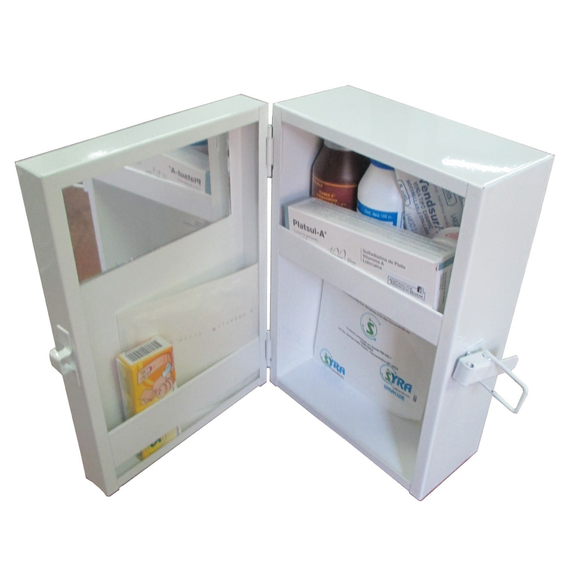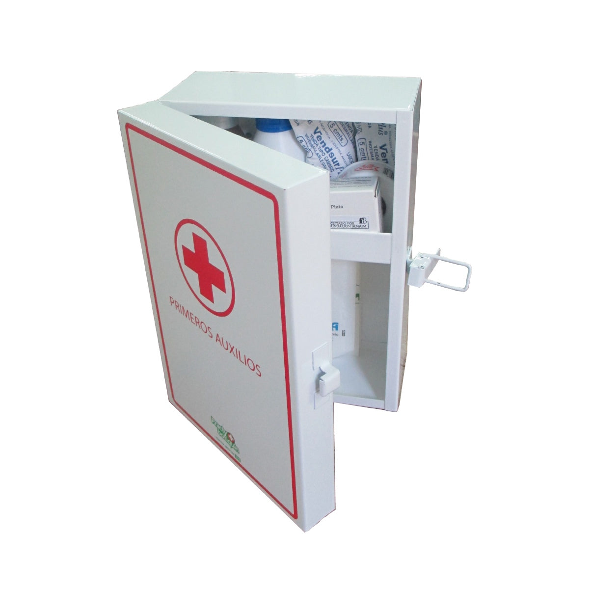 Material: Chapa pintura horneada color blanca, con cruz roja de Primeros Auxilios, espejo en contratapa y cierre porta candado.