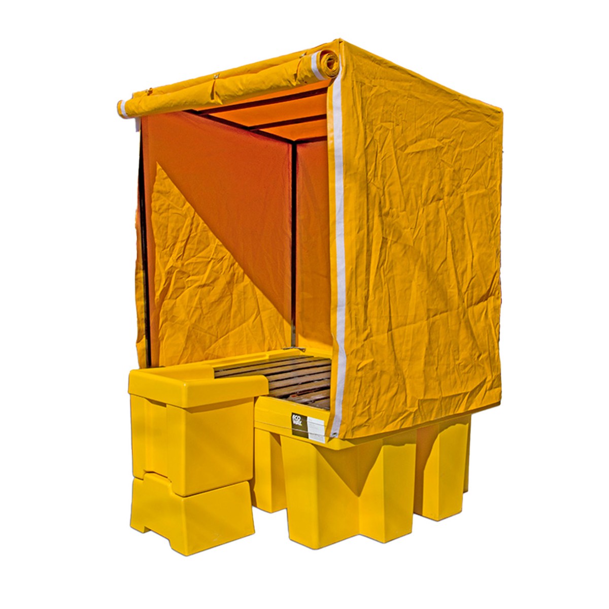 Cobertores de lona con una estructura de acero para proteger los pallets antiderrame ubicados al intemperie. Evitan que ingrese agua de lluvia, de modo de asegurar que siempre estén vacíos en caso de un derrame. Dieseñado con un techo inclinado para desviar lluvia sin que forme piletas en la superficie de la lona. Fabricado en lona Pampero 1000, con protección UV. Estructura desarmable para reducir costos de transporte y espacio en almacenamiento. Cuenta con una apertura de frente con cierre, para permitir el acceso al tambor o tanque almacenado.