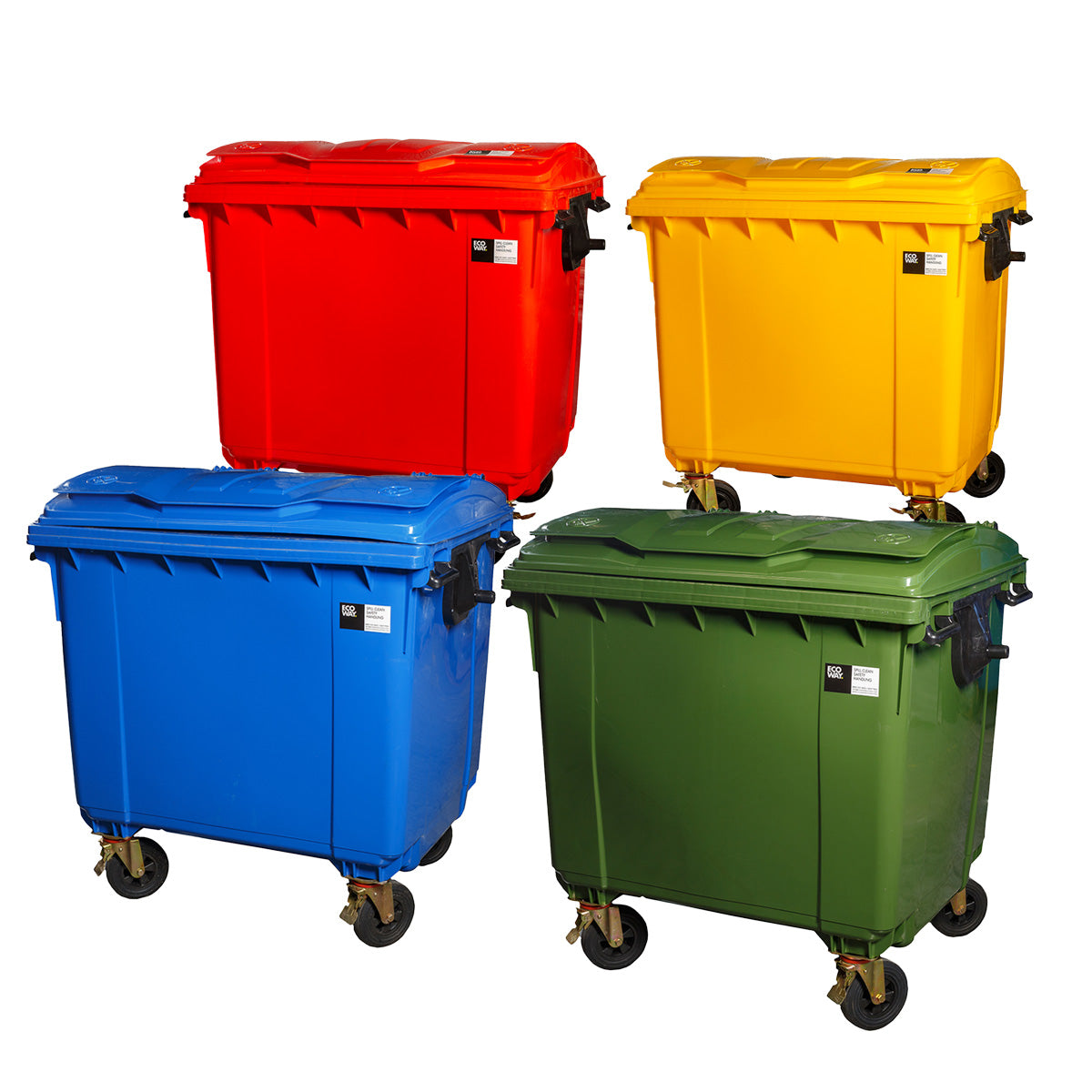 Contenedor plástico inyectado en PEAD para residuos de 1100 lts con 4 ruedas, y tapa rebatible con: labio de agarre, cierre semi- Hermético apto para intemperie y 4 nervios de refuerzo. Cuenta con muñones con refuerzos de acero en sus interiores para su descarga mecánica, 4 manijas para manipuleo en el cuerpo, válvula de desagote inferior, 2 bisagras de PEAD, y 17 nervios de refuerzo alrededor de la boca del cuerpo. Tiene cuatro ruedas giratorias, dos con freno, y todas con horquillas de acero galvanizado, las mismas cuentan con el interior de PEAD inyectado y exterior de goma maciza de 200mmØ.