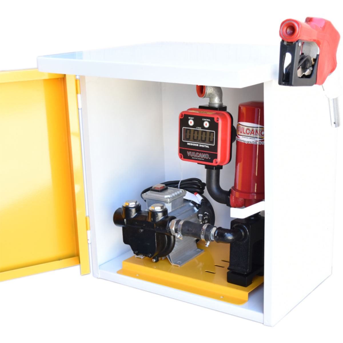 Electrobomba autocebante monofásicas para transvase de diesel montado en un Gabinete de chapa pintado con puerta con cerradura. Provisto con Cuadalimetro Digital de aluminio, contador de 4 digitos, 25mm de altura. Entrada y salida de 1" BSP con racord. Caudal máximo de 100 lts/min. Interruptor On/Off y cable con ficha 1,5 mts. Pistola de corte automatico y manguera de 4mts.