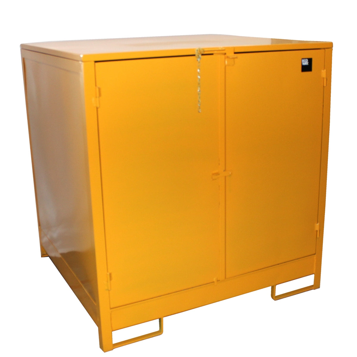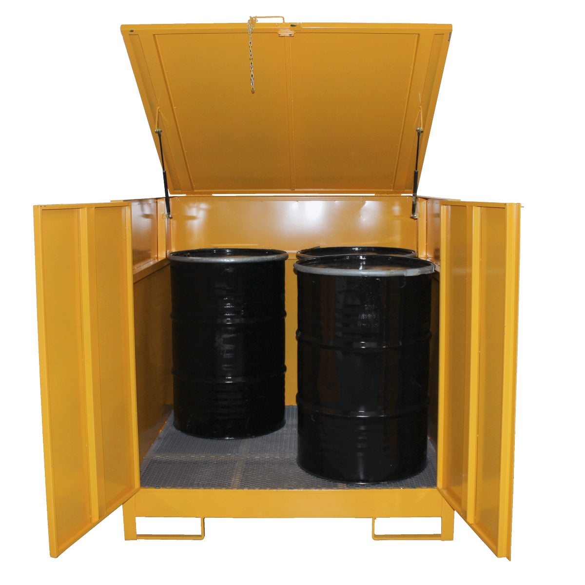 Gabinete construido en chapa, con tapa y puertas. Apto para contener 4 tambores de 200 lts, y con una bandeja de contención de 360 Lts de capacidad. La rejilla de apoyo en metal desplegado y laterales en chapa plegada. La tapa reforzada cuenta con amortiguadores hidráulicos para facilitar la apertura. Las puertas tienen un ojal para un candado. Cuenta con porta uñas de auto elevadores para facilitar su traslado.