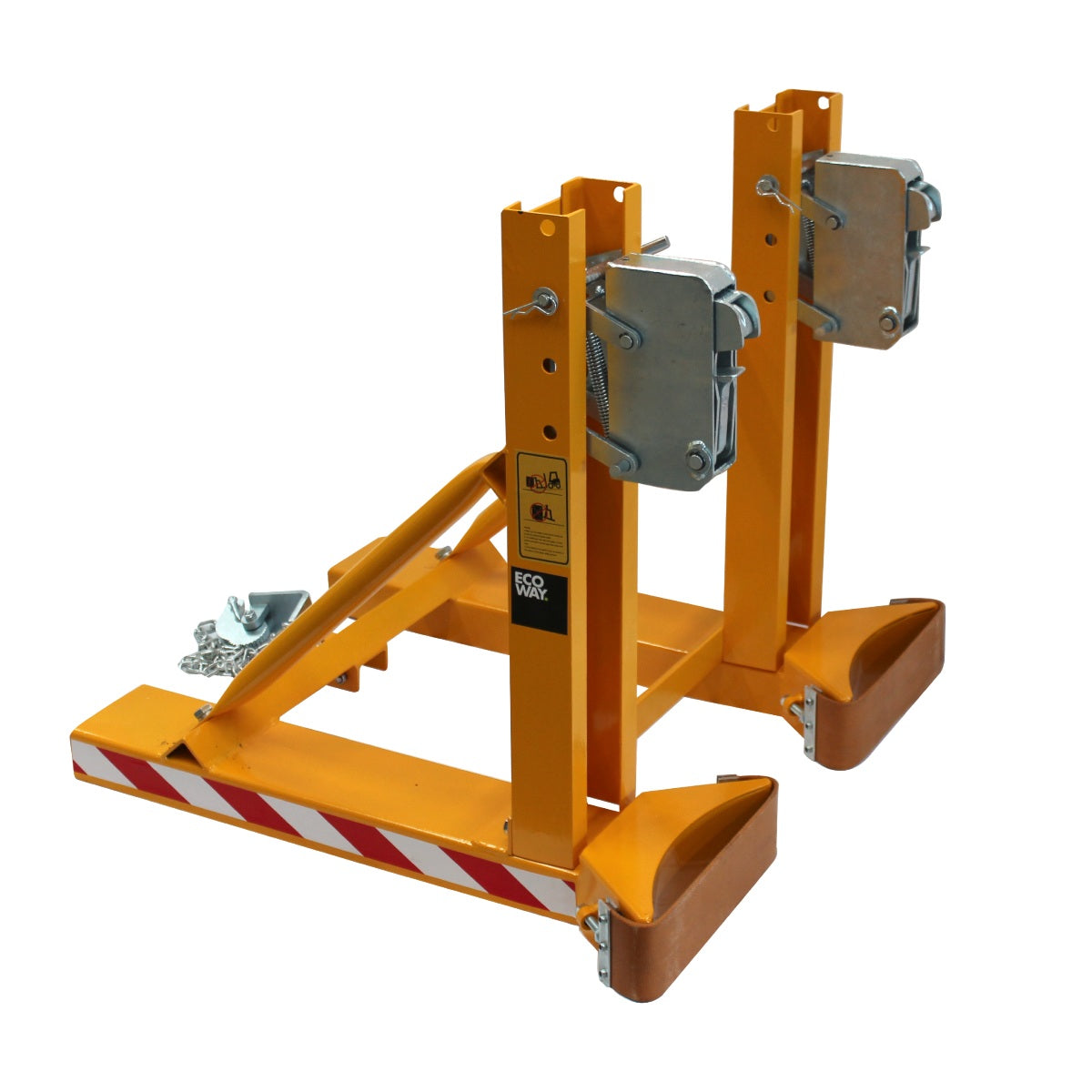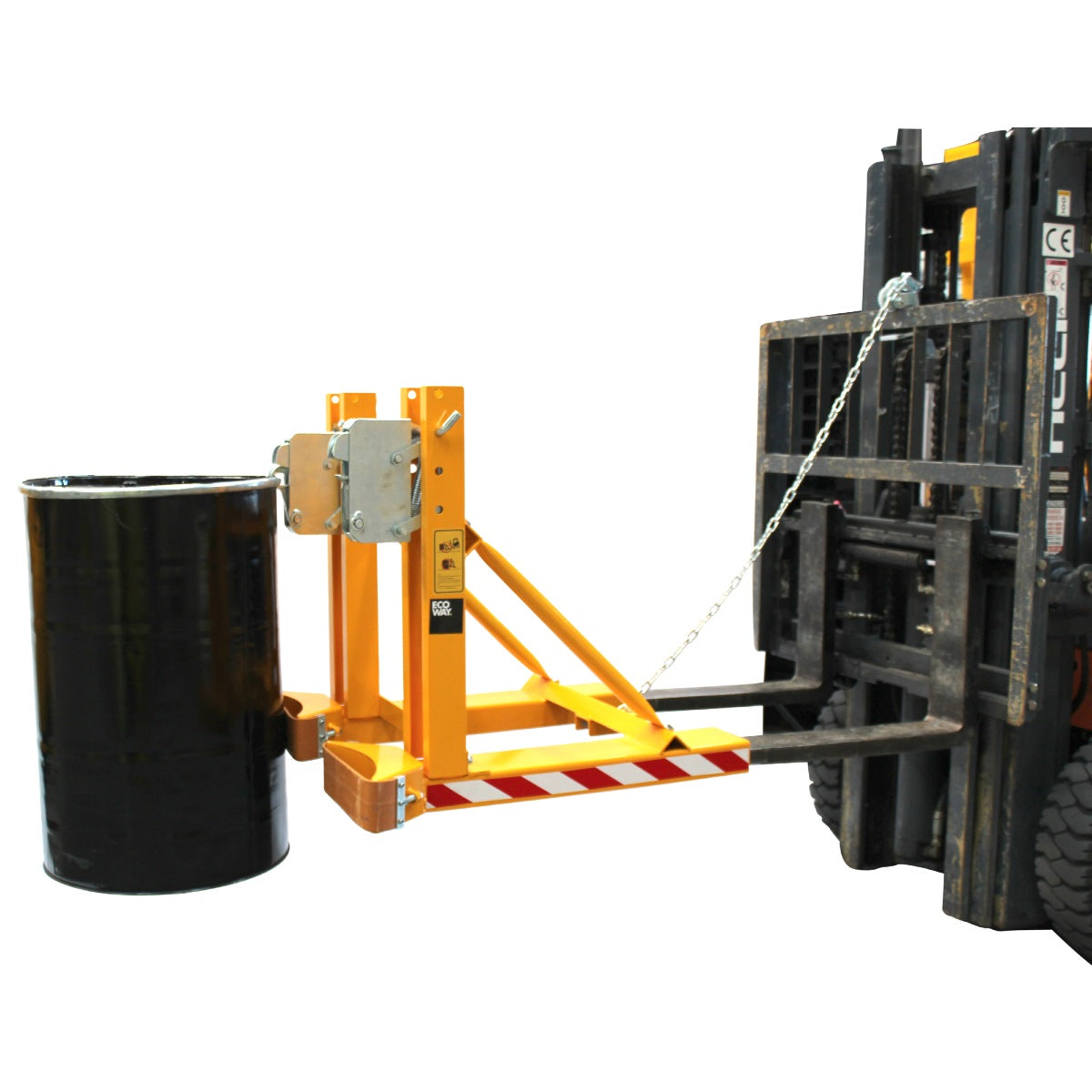 Pinza automática tipo pico de loro para 2 tambores de 200 litros. Aplicable a las uñas de cualquier autoelevador. Sujeta el tambor por el labio superior en forma segura. No requiere instalación hidráulica. Indicada para operación de tambores vacíos y llenos. Suspende el tambor por el anillo superior con un apoyo en la parte inferior del tambor.