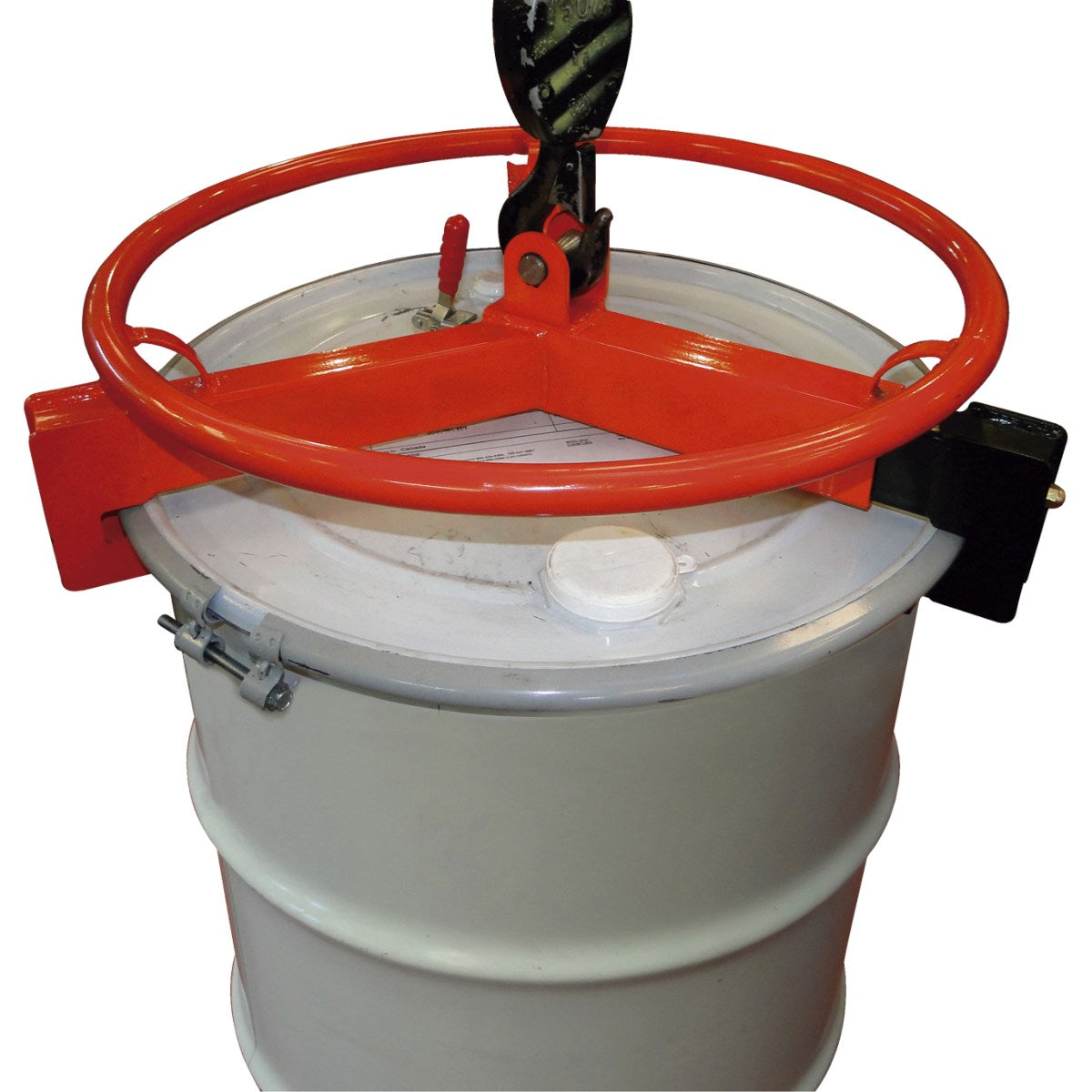 El volante RT0002, de confección mucho más robusta que el RT0001, está diseñado para el izaje y direccionamiento manual de tambores por medio de aparejos manuales, eléctricos o bien puentes grúa mediante un sistema de sujeción segura